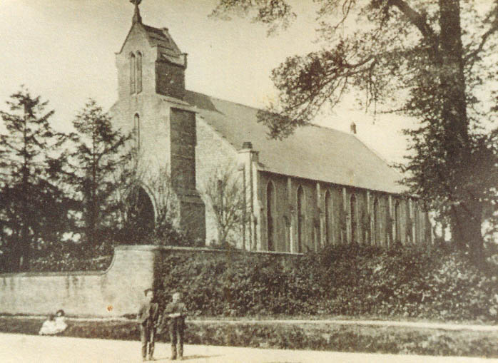 There was no Anglican church at Shaw until 1838 when a small church, pictured here, designed by T.H. Wyatt was built. A chapelry of Shaw, with Whitley, was formed in 1843. Gas heating was installed in 1846. As both Shaw and Whitley grew in size this church proved too small and was rebuilt in 1905 to a design of C.E. Ponting in the late Perpendicular style. He retained the north and south walls of the former nave and provided aisles formed from oak pillars and arches with a half timbered clerestory.