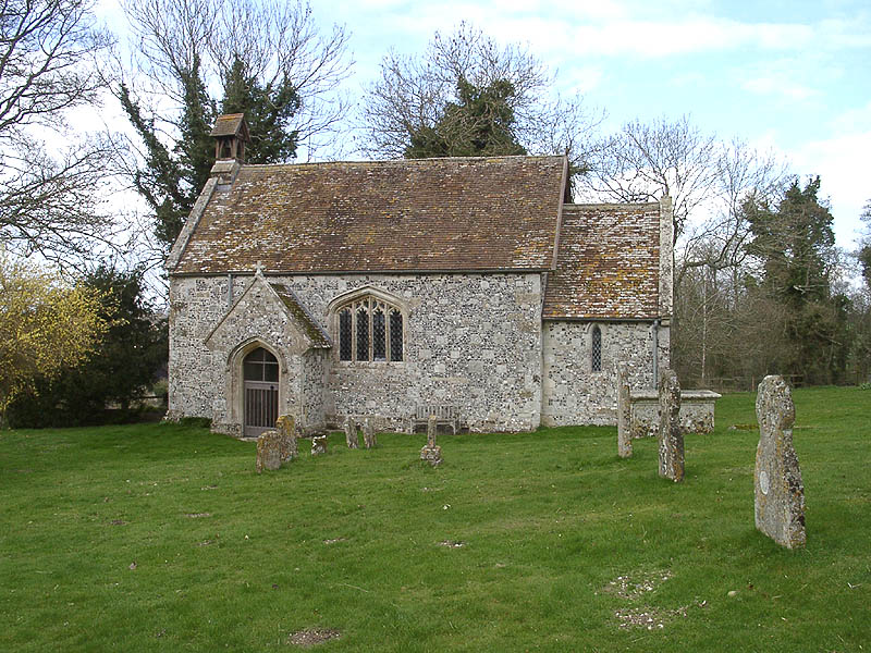 This small flint and stone church, seen here from the south, was restored in 1845 when the chancel and chancel arch were rebuilt, much of the nave refaced and a porch built. In 1923 Rollestone rectory was united with the joint benefice of Shrewton and Maddington, and in 1970 the 3 ecclesiastical parishes were united, being known simply as 'Shrewton' from 1972. The parish registers from 1654 to 1992 are held in the Wiltshire and Swindon Record Office.