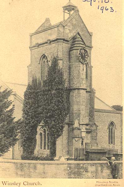 The earliest reference to a church in Winsley is in 1349 but as architectural evidence indicates an early Norman building there will have been one here from the late 11th or early 12th century.The church was rebuilt in the 15th century, in Perpendicular style, but only the three stage tower, with its saddleback roof, remains from this period. Between 1539 and 1846 Winsley was served by curates from Bradford, and from the early 18th century a list of the annual offerings for these vicars survives. In 1704 this included the left shoulder of every calf killed, one tenth of every calf sold, one tenth of all honey produced, 5 pence (0.2p) for every man, wife and garden, 3 eggs for every cock and 2 for every hen to be paid on Good Friday, twopence (0.1p) for everyone over 16 years, fourpence for every woman churched (service after the birth of a child), and 10 shillings (50p) for every death where the estate was worth over £40.
