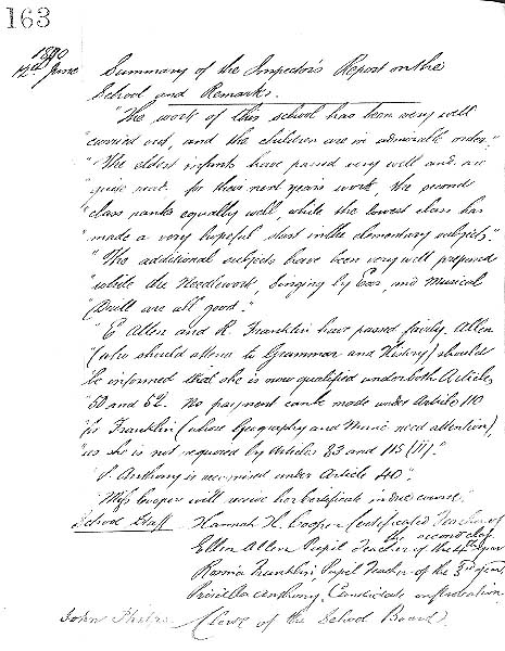 Subjects taught to the infants were reading, writing, arithmetic, needlework, knitting, singing, geography and history, although the youngest ones first learned reading, writing and singing only. Object lessons were given when the children studied all aspects of a particular object; subjects included, bread making, an ostrich, a cornfield, an elephant, a bee, the colour blue, a candle and coral. During the last quarter of the 19th century schoolmistresses changed every five or six years and when Miss Millicent Nicklen took up her duties in January 1900 she was the sixth mistress to do so. The mistresses were assisted either by two pupil teachers or one pupil teacher and one monitor. Pupil numbers continued to increase; by the late 1870s the average was over 80, while by the early 1880s it was over 100, and continued into the 1890s. By 1899 numbers had fallen a little and there were only 99 children on the school roll, with attendances averaging from 71 to the mid 80s.