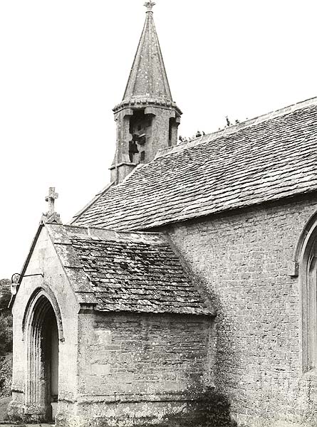 A chapel here may have been served from Malmesbury in the 12th century and a plan made before the church was rebuilt in the 19th century suggests a 12th century origin for the structure. It was a long, narrow building of which the earliest surviving record dates from 1341. All that now remains of the earlier church is a 15th century south doorway, an octagonal west bellcot, and a screen that divided the chancel from the nave, and a 17th century pulpit. The church was dedicated to All Saints by 1763. This will always have been a small church with a fairly small congregation, although the attendance of 38 on Census Sunday in 1851 was said to be smaller than usual.