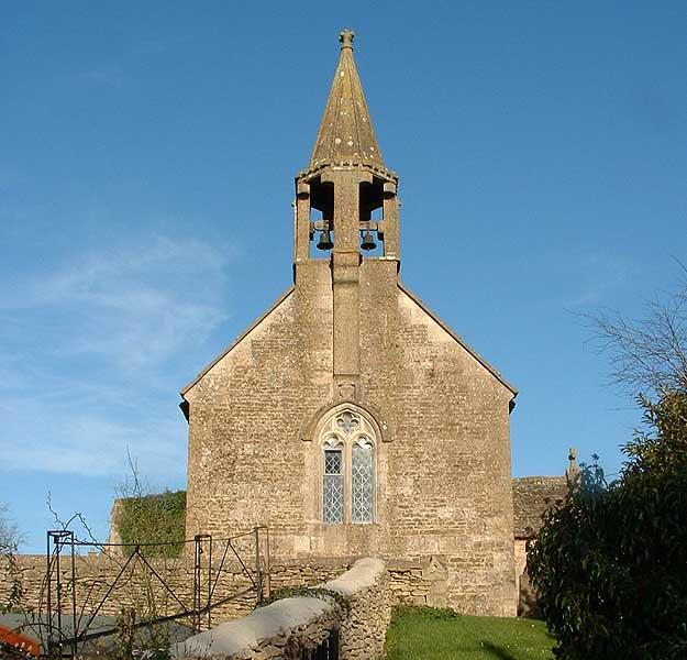 A chapel here may have been served from Malmesbury in the 12th century and a plan made before the church was rebuilt in the 19th century suggests a 12th century origin for the structure. It was a long, narrow building of which the earliest surviving record dates from 1341. All that now remains of the earlier church is a 15th century south doorway, an octagonal west bellcot, and a screen that divided the chancel from the nave, and a 17th century pulpit. The church was dedicated to All Saints by 1763. This will always have been a small church with a fairly small congregation, although the attendance of 38 on Census Sunday in 1851 was said to be smaller than usual.