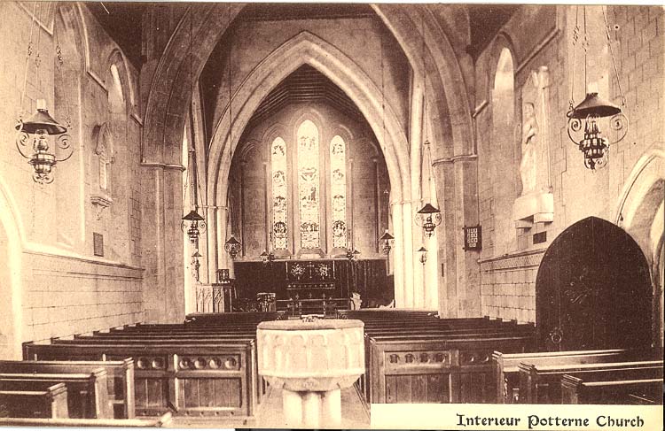 A church was probably built here around 950, on a site about 95 metres south west of the present church. A 10th century font was found under the floor of the nave during the 1872 restoration and is now at the west end of the nave. The priest at the time of the Domesday Book (1086) held land worth 20 shillings (£1.00). In c.1091 the churches of Potterne and West Lavington, with their tithes, were among the endowments that Bishop Osmund made to his cathedral chapter at Salisbury. The two churches remained linked for some centuries. The present church was built in the mid 13th century and is comparatively little altered, with the addition of a south porch in the 14th century and a tower, or possibly the upper part of the tower, in the 15th century. There is a chancel, nave, north and south transepts, porches and a central tower. There are original lancet windows, a piscina and aumbry (recess or cupboard) in the chancel, and a piscina in each transept. The font is early 15th century and the carved oak pulpit is late 15th century. An organ was purchased in c.1723 from a bequest of Thomas Flower.