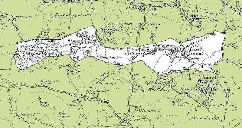 From the Ordnance Survey 1896 revision of the one inch to one mile map. The modern civil parish boundary has been superimposed.
