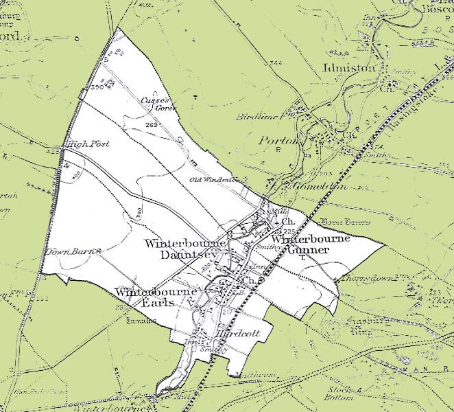 From the Ordnance Survey 1896 revision of the one inch to one mile map. The modern civil parish boundary has been superimposed.