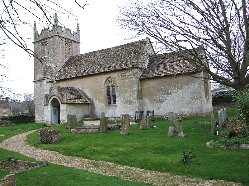 The church has a small unbuttressed west tower with Somerset tracery in the bell-openings and a three sided stair turret rising to the bell stage. The walls are of ashlar with stone tiled roofs and coped gables with saddlestones. G. Forder of Winchester built the nave, chancel and south porch in 1823. The rest of the church was virtually all restored in 1883 and all the windows have Perpendicular style tracery from this date with hoodmoulds over them. The interior is plain with plastered walls and roof, a chamfered chancel arch and 19th century fittings. During th Civil War the church was partially destroyed by Cromwell's troops on their way to Bristol to embark for Ireland. For 200 years the parishioners of Slaughterford had to walk to Biddestone to worship in the church there. An inscription dated 1823 records the re-building, mainly using funds raised, locally after two centuries of disuse. The church remains open for sevices and is approached through a field from the road.