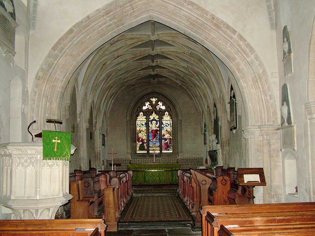 The earliest part of this Anglican church is the chancel arch, pictured here, built in c.1220. Above the arch there is an unplastered patch which contains faint traces of wall painting. Fragments of medieval floor tiles were found in 1900 beneath the chancel floor; the stone tiles in the chancel were removed in 1974. The church had a new chancel by the 14th century and very fine vaulting can be seen. The bosses are carved with St. Michael, Abraham, a pelican and a mermaid, among others. There is a priest’s door on the north side through a buttress. The burial crypt under the chancel has been bricked up.