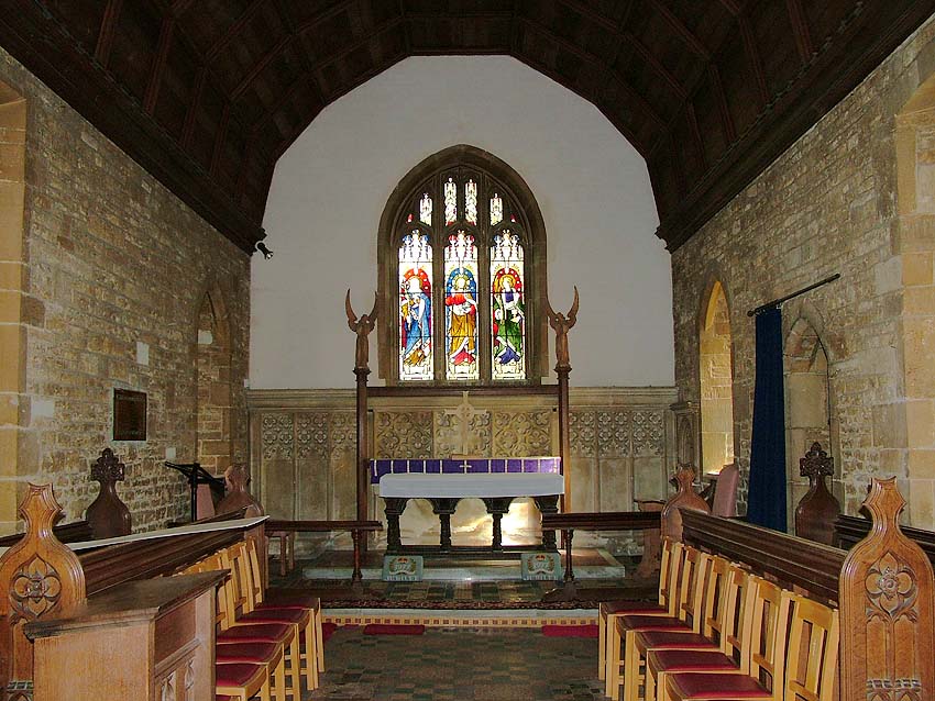 The tower of the building was built in the 15th century, possibly to replace an already existing central tower in the church; the west doorway is 15th century with a hoodmould and a three light 15th century window above. In the early eighteenth century a west gallery was added to house fitted box pews. Also, in 1879 the chancel, pictured here, and chancel arch were rebuilt in fourteenth century style. The entire church was restored in 1889, and under directions from C. E. Ponting the gallery was enclosed to form a baptistery. The pulpit, altar table, and font cover were all later additions to the church in the 1630s.