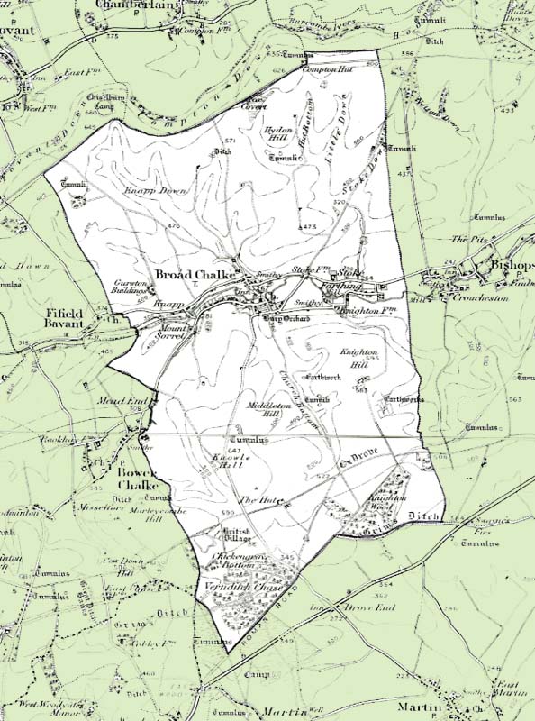 From the Ordnance Survey 1890s revision of the one inch to one mile map. The modern civil parish boundary has been superimposed.