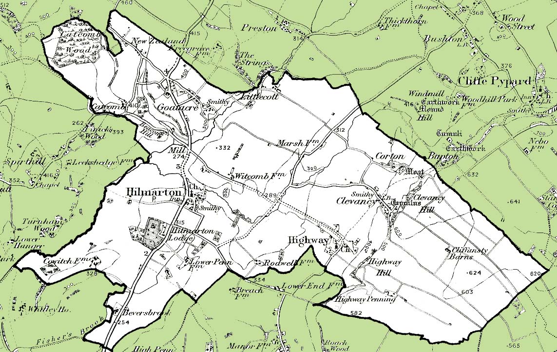 From the Ordnance Survey 1890s revision of the one inch to one mile map. The modern civil parish boundary has been superimposed.