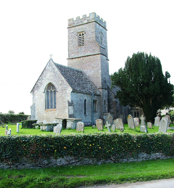 The 15th century three stage tower may have replaced an earlier one or could have been added to an existing nave and chancel. Nave and chancel, described as ‘an ancient structure’ in Kelly’s Wiltshire Directory of 1848, was taken down in 1848 when the remains of a stone cross were found. This medieval churchyard cross was restored and re-erected to the north of the church by the Rev. A, Austin. The new building, in Perpendicular style, was designed by diocesan architect T.H. Wyatt and comprised chancel, nave and porch. The 1856 east window is by C. and A. Gibbs. A 15th century female effigy has been replaced in a recess in the north wall.