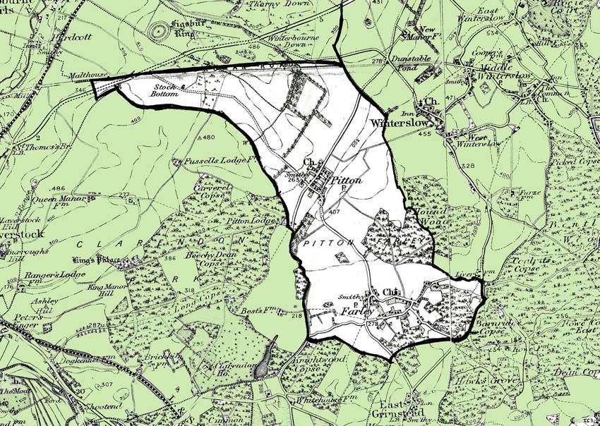 From the Ordnance Survey 1890s revision of the one inch to one mile map.The modern civil parish boundary has been superimposed.