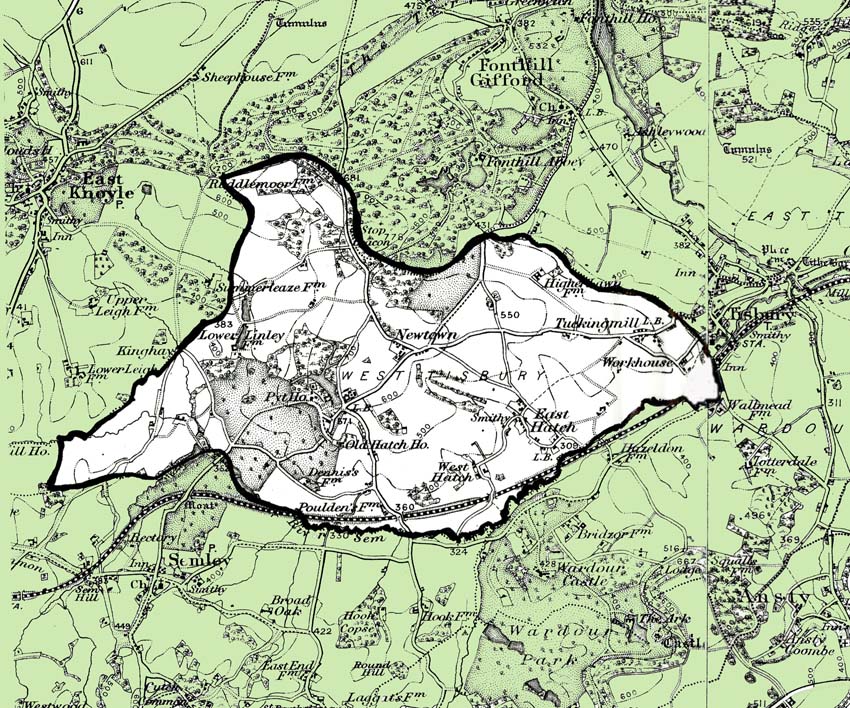From the Ordnance Survey 1890s revision of the one inch to one mile map.The modern civil parish boundary has been superimposed.
