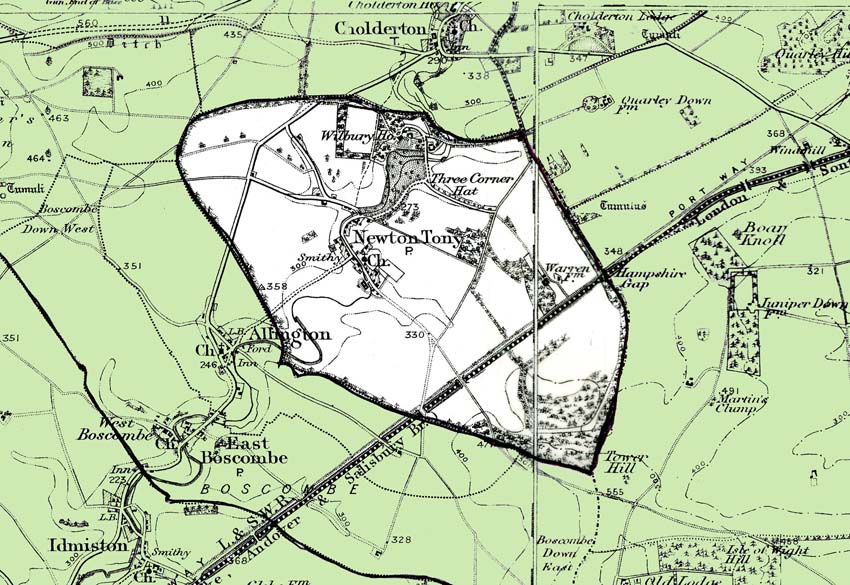 From the Ordnance Survey 1890s revision of the one inch to one mile map.The modern civil parish boundary has been superimposed.