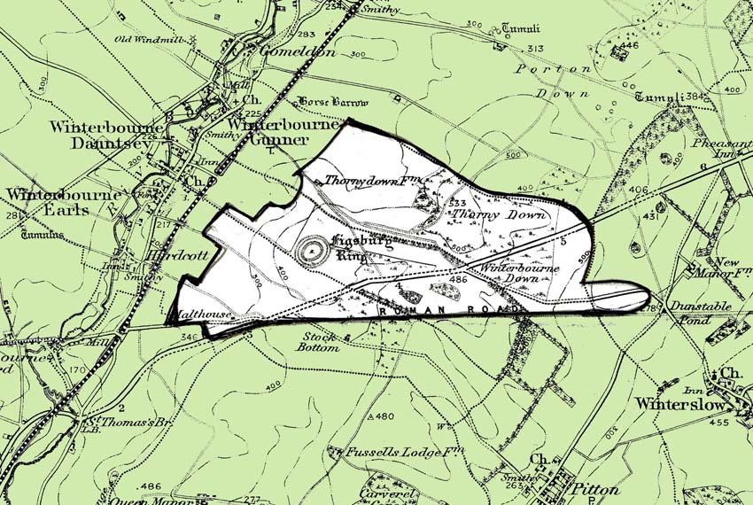 From the Ordnance Survey 1890s revision of the one inch to one mile map.The modern civil parish boundary has been superimposed.