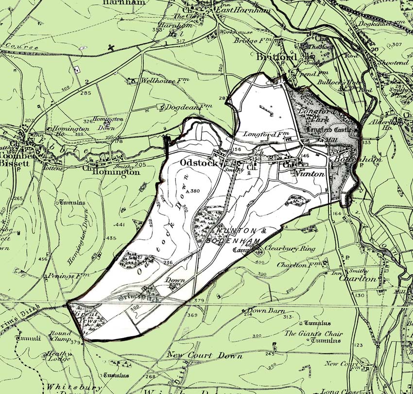 From the Ordnance Survey 1890s revision of the one inch to one mile map.The modern civil parish boundary has been superimposed.