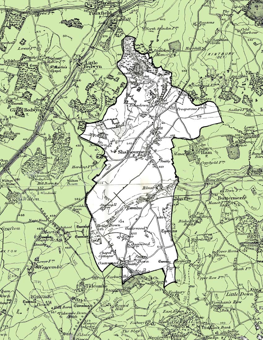 From the Ordnance Survey 1890s revision of the one inch to one mile map.The modern civil parish boundary has been superimposed.