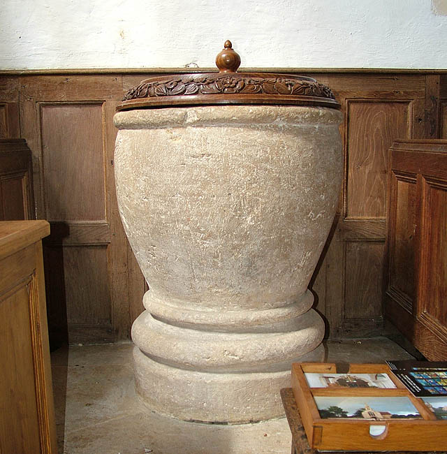 In front of the north window in the nave stands a fine ‘three-decker’ pulpit. This oak panelled, late 17th century furniture consists of a reader’s desk, clerk’s desk and pulpit. It was given by John Hall who was Lord of the Manor. The pulpit canopy was added in 1765. Above the panelling on the nave walls can be seen two 15th century consecration crosses, on either side of the west door. There are the remains of two others on the north and south walls.