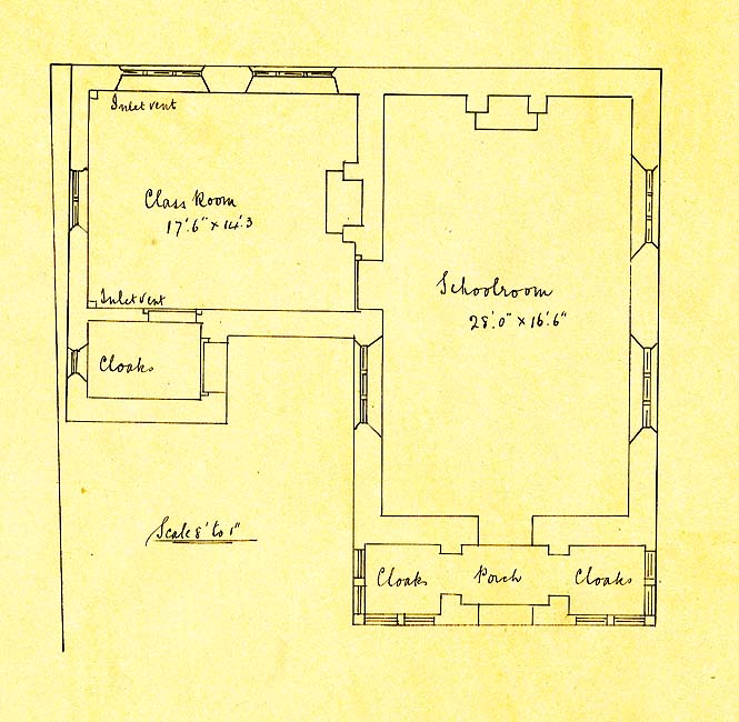 In 1831 a day school was held in one of the village cottages and attended by only 10 children. By 1841 a trust was created for a school in union with the National Society. The new school was started by Reverend Henry Harvey and built at a cost of £179 on land belonging to John Wiltshire. The school was financed with £20 from the National Society and £37.10s. from the Government as well as £99 from church collections. The large schoolroom measured 28 feet by 16 feet 6 inches and the smaller class room (built later) measured 17 feet 6 inches by 14 feet 3inches. The porch was flanked on either side by coat hooks and a toilet existed outside and was accessed from the playground.