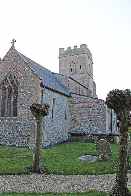 Externally the church is constructed of sarsen and flint rubble, while the tower is faced with ashlar stone. On the east side of the churchyard is an undated burial mound which was excavated in 1885. Saxon and medieval burials were found to have been interred in the top of the mound.