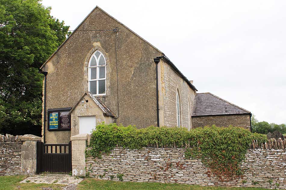 A house and garden occupied by Micaiah West was licensed for Baptist worship in 1820. The chapel is built of coursed rubble with a rendered gable front and pointed arch windows. It opened in 1823 and a schoolroom was built c.1843. The interior was refitted and the windows altered in 1889. Open air baptisms took place in the 19th century. By the mid 19th century the church at Nettleton was divided in its attitude to doctrine, with some members having Cavlinistic tendencies, and as there were no Sunday morning services, John Russell, a Calvinist, asked the supply ministers to preach on a grassy bank at West Kington. After some years the meeting at West Kington made a complete break with the chapel at Nettleton. The chapel at Nettle remains open and has a very pleasant and tidy graveyard.