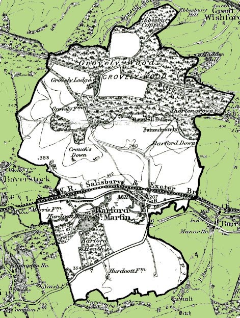From the Ordnance Survey 1890s revision of the one inch to one mile map. The modern civil parish boundary has been superimposed.