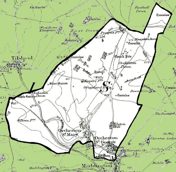 From the Ordnance Survey 1890s revision of the one inch to one mile map. The modern civil parish boundary has been superimposed.