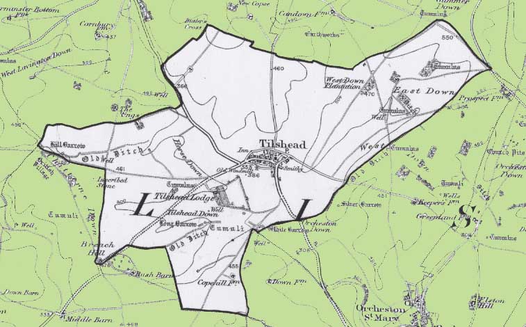 From the Ordnance Survey 1890s revision of the one inch to one mile map. The modern civil parish has been superimposed.
