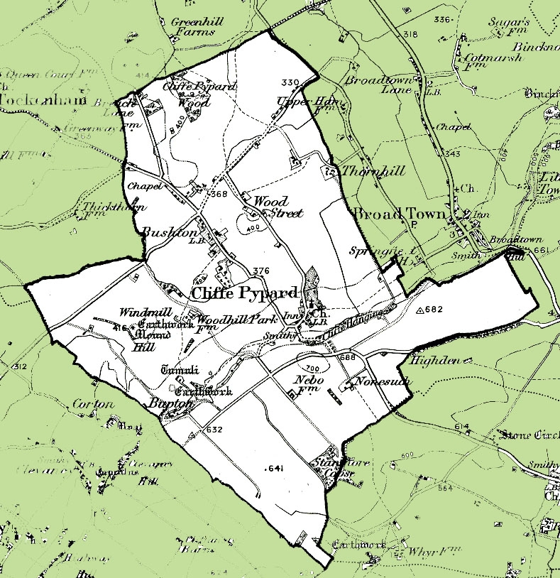 From the Ordnance Survey 1890s revision of the one inch to one mile map. The modern civil parish boundary has been superimposed.