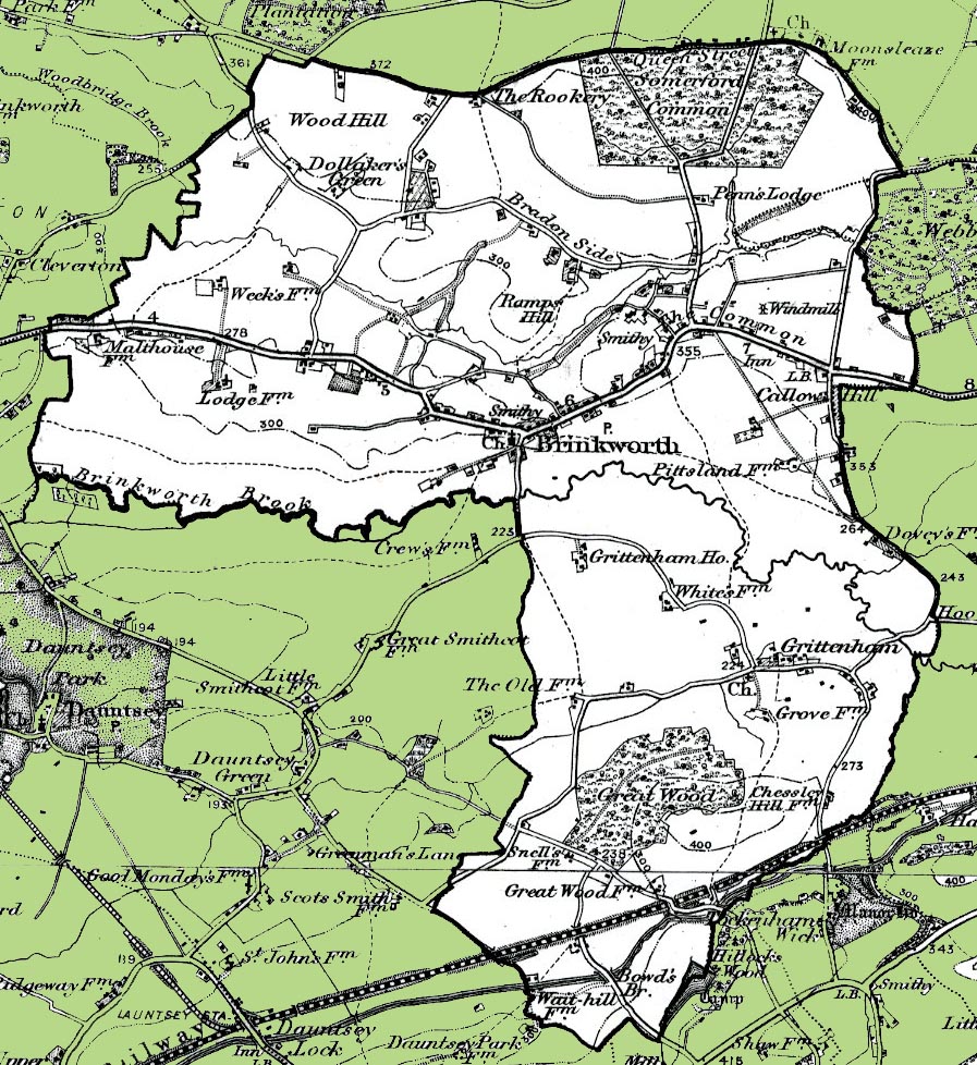From the Ordnance Survey 1890s revision of the one inch to one mile map. The modern civil parish boundary has been superimposed.