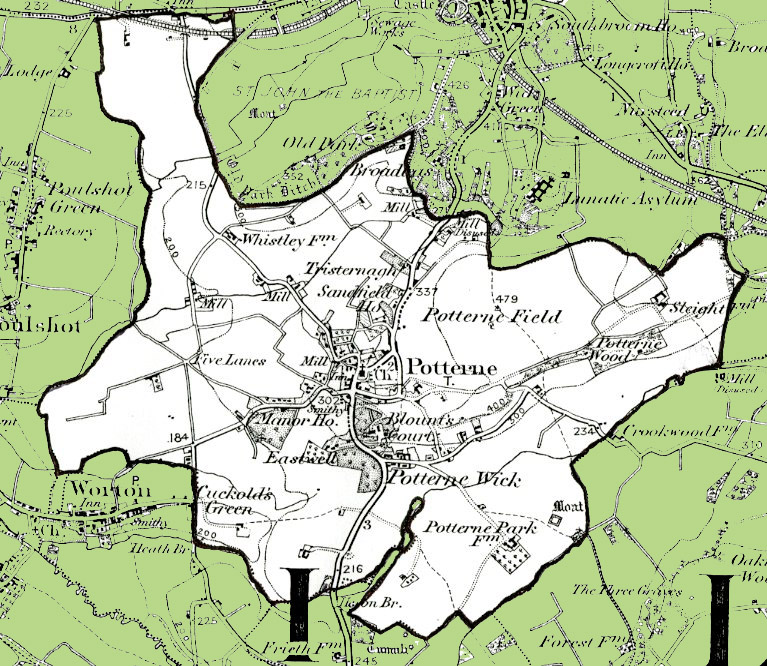 From the Ordnance Survey 1890s revision of the one inch to one mile map. The modern civil parish boundary has been superimposed.