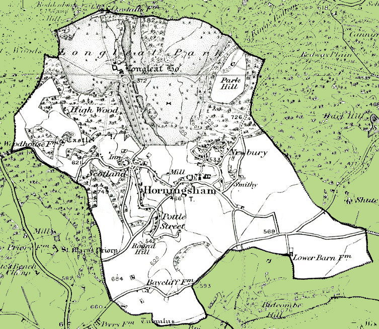 From the Ordnance Survey 1890s revision of the one inch to one mile map. The modern civil parish has been superimposed.