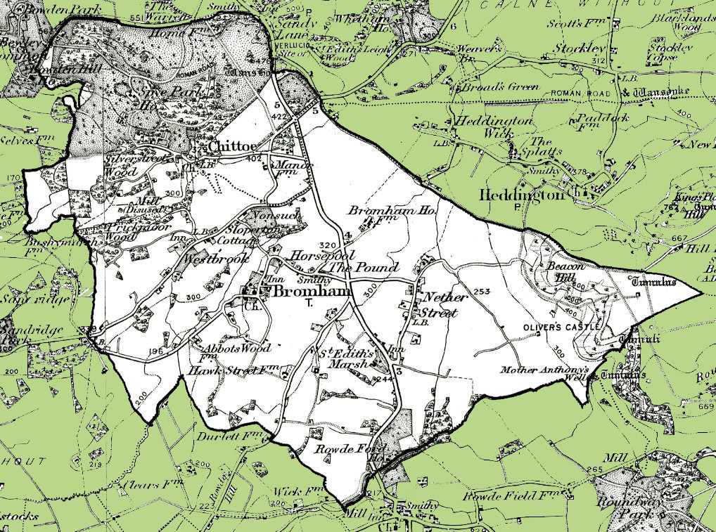 From the Ordnance Survey 1890s revision of the one inch to one mile map. The modern civil parish boundary has been superimposed.