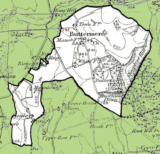 From the Ordnance Survey 1890s revision of the one inch to one mile map. The modern civil parish boundary has been superimposed.