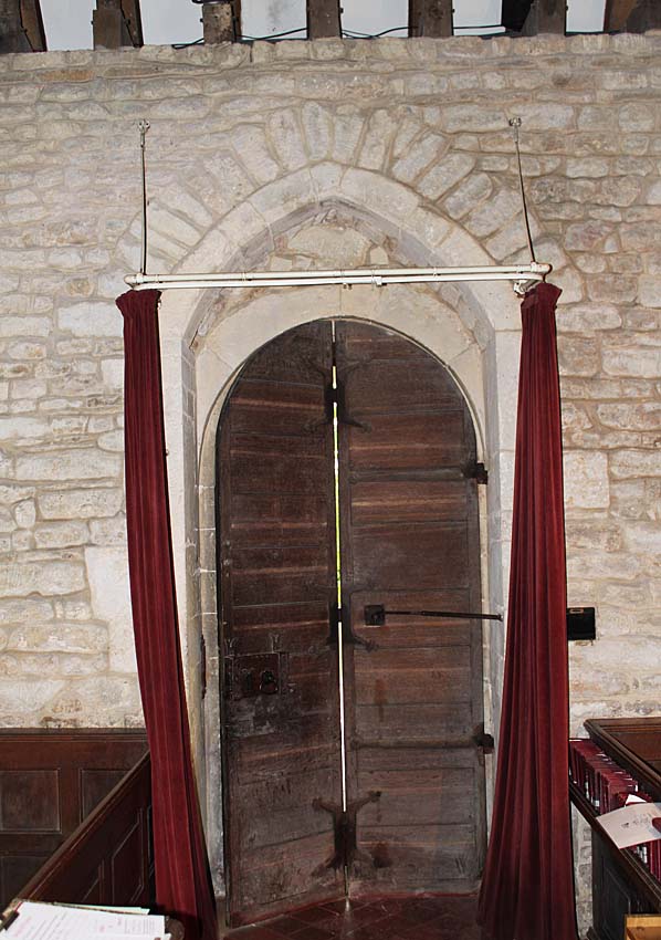 Up above, the nave ceiling is of a ‘trussed-rafter’ type, with a wooden doorway set in the wall at rood-loft level. The organ chamber stands at the west of the church, below the bell turret, and was built by Flight and Robson of London. The organ would have originally stood in a large house or manor.