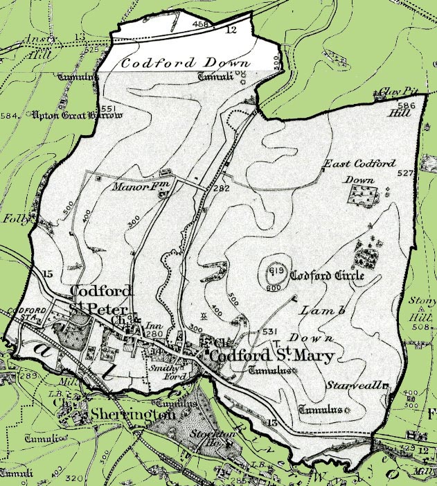 From the Ordnance Survey 1890s revision of the one inch to one mile map. The modern civil parish boundary has been superimposed.