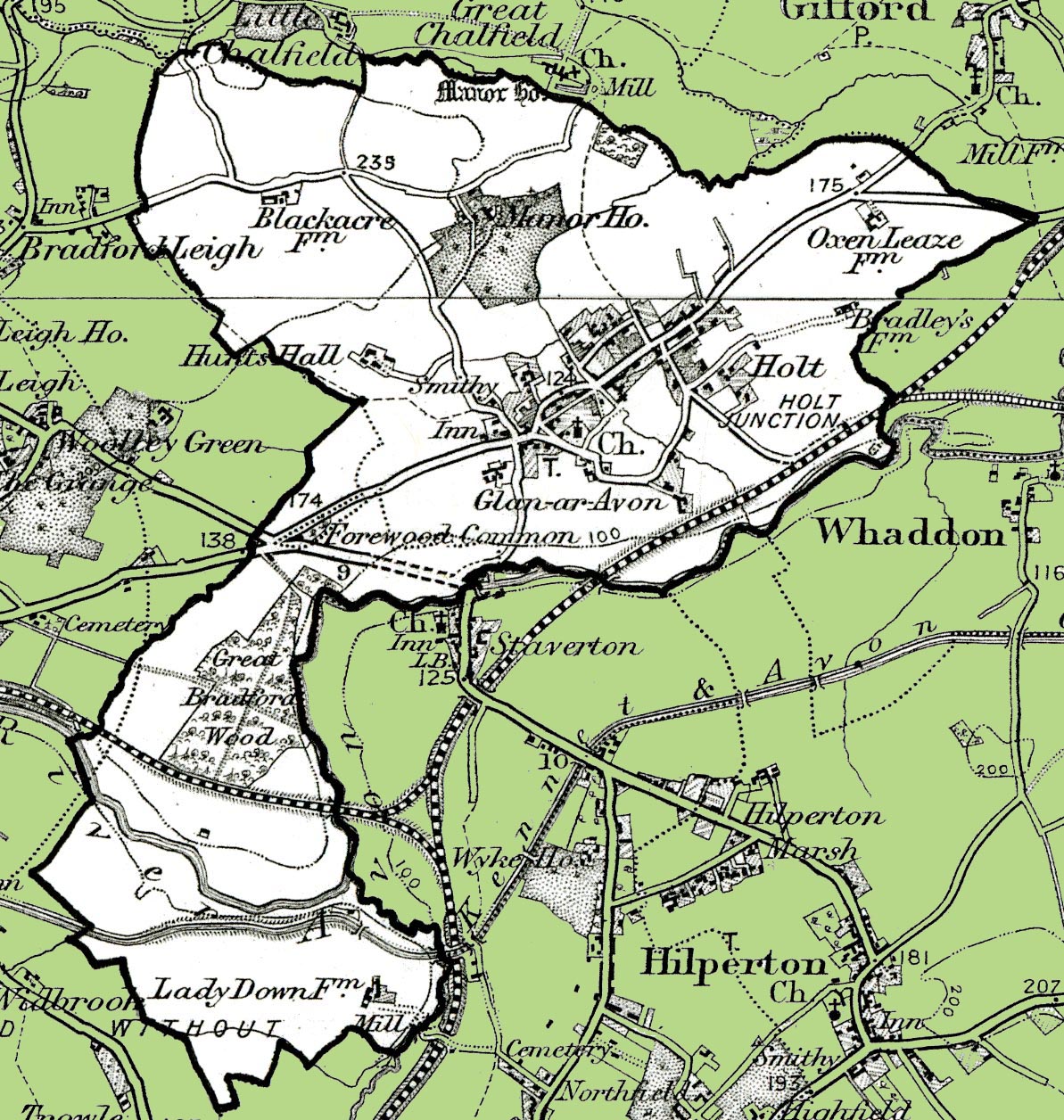 From the Ordnance Survey 1890s revision of the one inch to one mile map. The modern civil parish boundary has been superimposed.