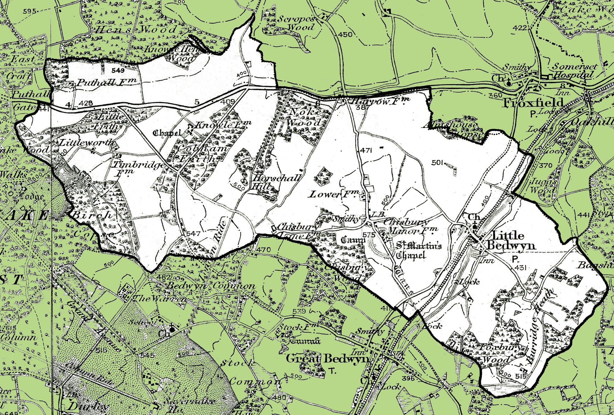 From the Ordnance Survey 1890s revision of the one inch to one mile map. The modern civil parish boundary has been superimposed.