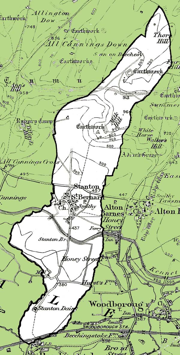 From the Ordnance Survey 1890s revision of the one inch to one mile map. The modern civil parish boundary has been superimposed.