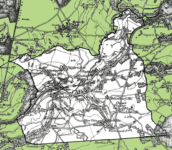 From the Ordnance Survey 1890s revision of the one inch to one mile map. The modern civil parish boundary has been superimposed.