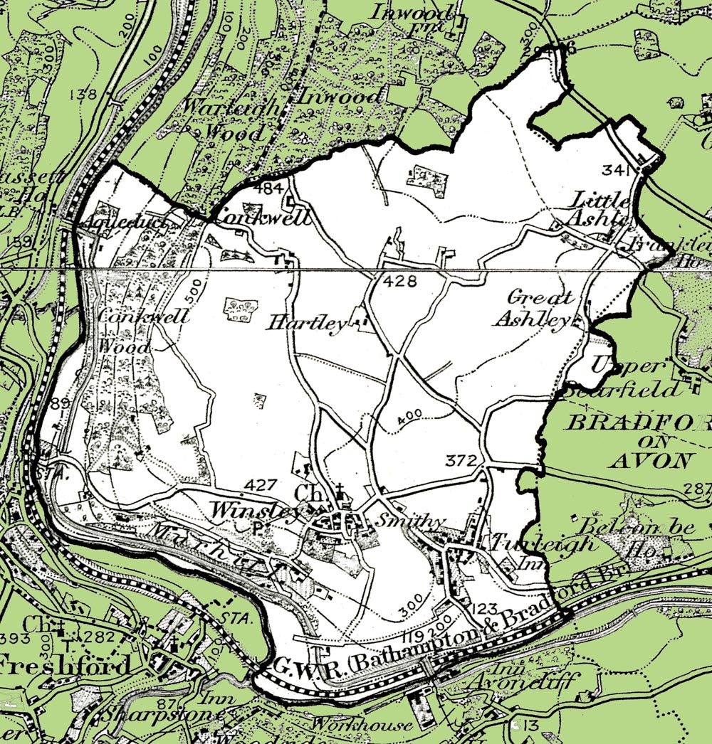 From the Ordnance Survey 1890s revision of the one inch to one mile map. The modern civil parish boudary has been superimposed.