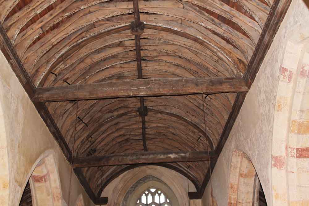 The porch has fixed stone benches and leads to a 15th century Tudor-arched doorway with a 19th century door. There is a cusped stoup to the right. The nave has a three-bay late Medieval arch-braced collar rafter roof, while the three-bay north and south arcades are late 13th century with traces of red painted decoration on the arches and walls above. In the south aisle is a trefoil-headed piscina and a blocked doorway. On the north wall of the tower is an unusual painted bell-ringing mural dated 1692 on the west panel; there were originally seven panels for a peal of five bells, with red-painted figures.