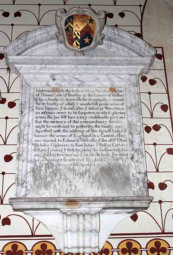 Memorial to Mary Nicholas, died 1686, aged 67. A sister of Jane Lane, she played a part in the rescue of Charles II after the Battle of Worcester. As ';Alice Lee'; her role in this adventure (which occurred before she married into the Nicholas family and came to Wiltshire) was immortalized by Sir Walter Scott in the novel Woodstock.
