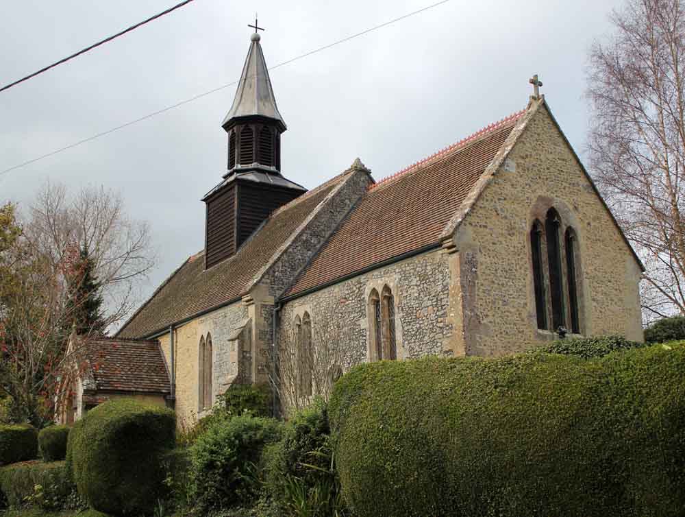 The church building is located west of the village and is built of rubble stone with freestone dressings; it consists of a chancel, nave, north vestry, south porch and bellcot. The late 13th century church had windows with grouped cusped lancets. The building was partly rebuilt from 1876 to 1878, and restored to the original by Henry Weaver of Devizes. The west gallery was removed, the north vestry was added and the interior was refitted. The 12th century font with Jacobean carved bower at the base was retained, as was the 14th century piscina. The 17th century pulpit was moved from the south east to the north east corner. The chancel arch was taken down and a new one erected and an ancient stone coffin with no lids or remains was discovered on the north side of the altar. A licence was awarded to perform divine service in the schoolroom while this restoration was undertaken. The final cost of the restoration was £1,240 and the church was re-opened in February 1878.