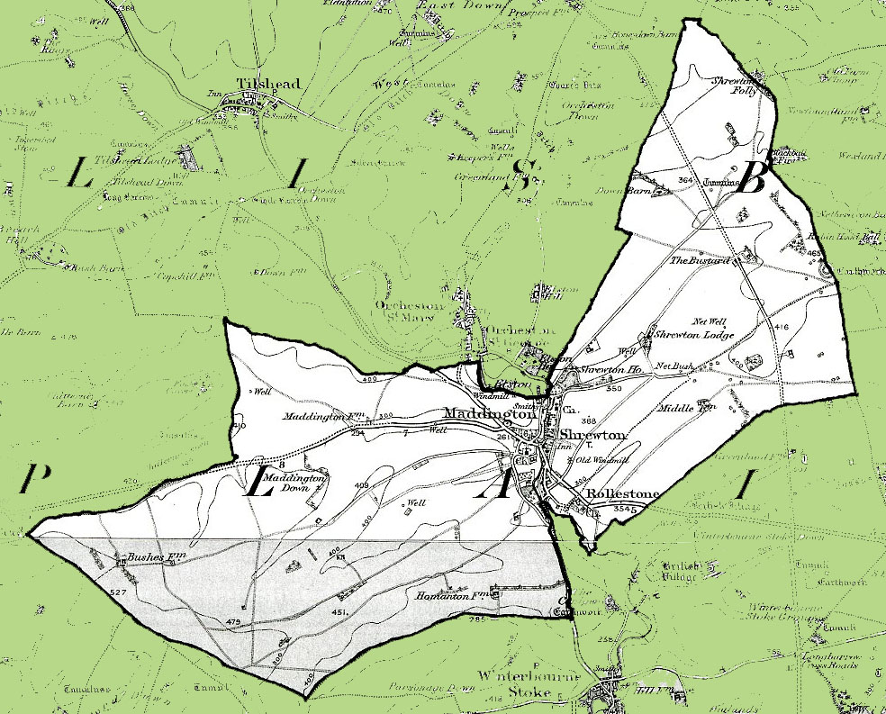 From the Ordnance Survey 1890s revision of the one inch to one mile map. The modern civil parish boundary has been superimposed.