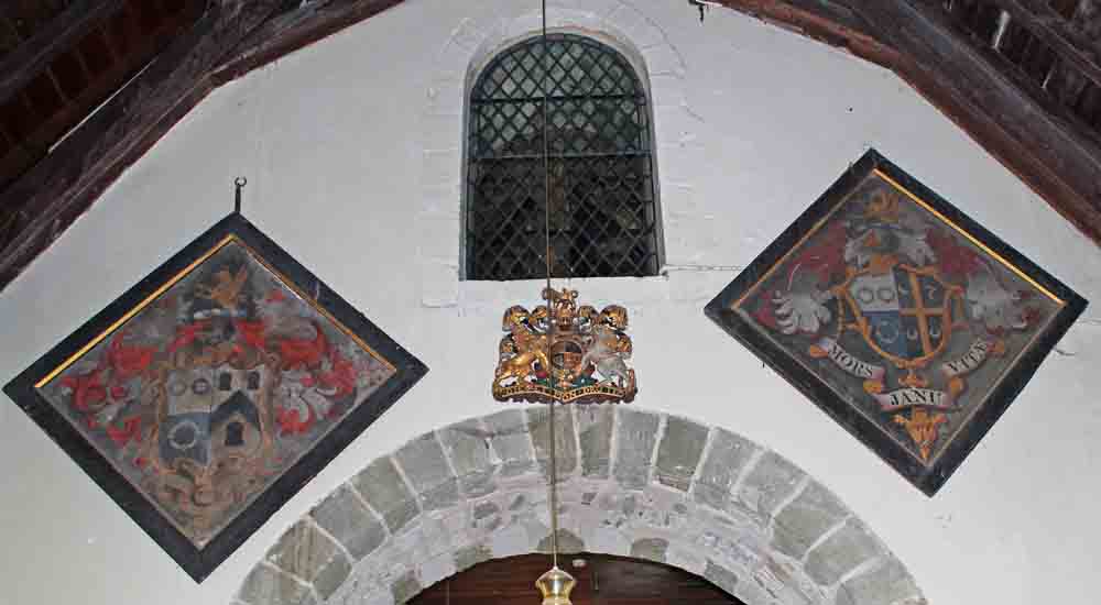 There are two hatchments (armorial shields painted onto a diamond shape) hanging on the west wall of the church, one commemorating Robert Duke, died 1749, and the other, his son, died 1793. The carved arms in the centre are those of George III.
