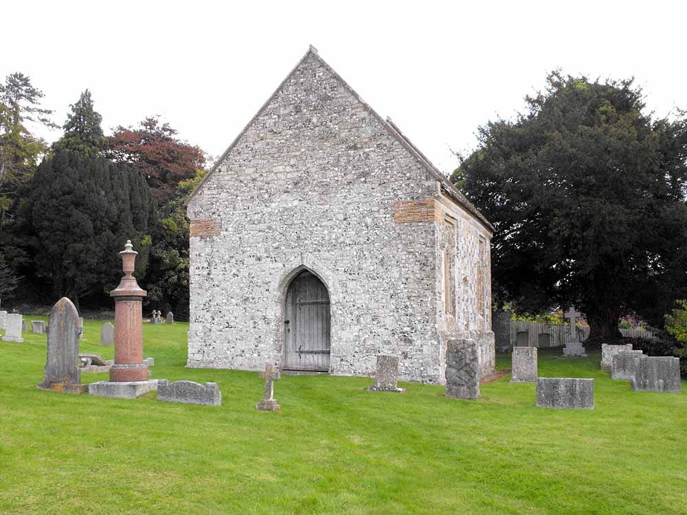The chancel at St Mary’s is built of chequered limestone and flint with a tiled roof. The interior is simple, with rendered walls and a flagstone floor. Some fragments of medieval stained glass from the old All Saints church have been incorporated into the windows. The canopied tomb mentioned by Colt Hoare is still there. Two memorial tablets are on the west wall and there are two graves in the floor.