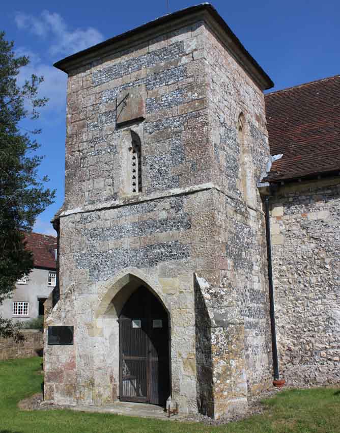 The church was visited in the late 1820s by Sir Richard Colt Hoare of Stourhead. He described the building as very small; the nave measuring 33 feet 6 inches long by 16 feet 4 inches wide. The chancel was 18 feet 9 inches long by 13 feet 3 inches wide. The church consists of a nave and chancel with an entrance below the south tower. It has no aisles. The building material is flint and limestone with a fishscale tiled roof. The nave was built in the 12th century while the chancel was possibly rebuilt in the early 14th century when the porch and tower were added and new windows set in the nave. The exterior wall on the north side of the nave shows a blocked 12th century round-arched doorway with tympanum and a lintel with rosettes. Both the east and west windows are 14th century. A photograph taken in 1940 shows, on the east side of the tower, a small lean-to type structure, built in keeping with the church and with a conical roof. This may have been the boiler house that was removed in the late 1970s. Just inside the entrance is an inner doorway with a 19th century hoodmould, over which is a beaded circular tablet with a relief-carved Agnus Dei, said to be 12th century. The church has also retained its 12th century cylindrical stone font.