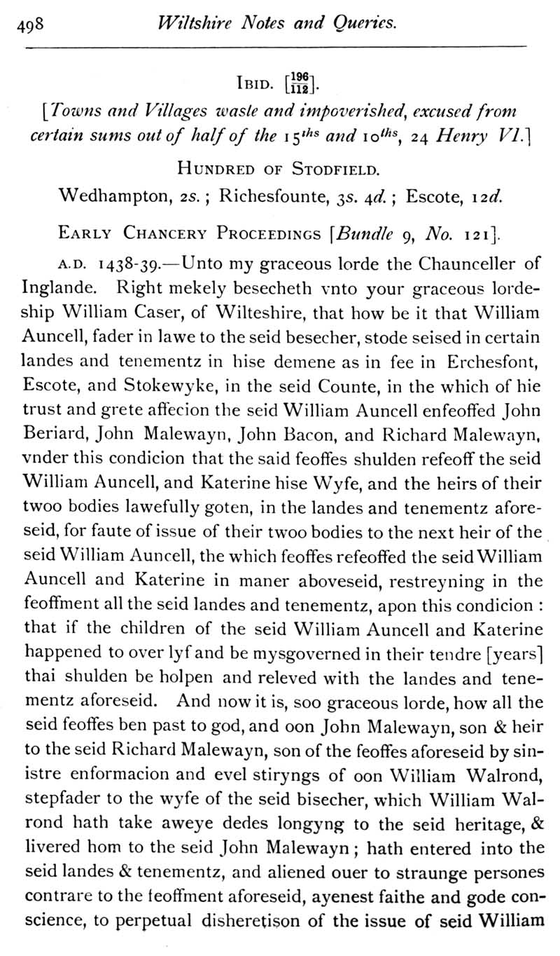 Chapter 12 Montacute, Earl of Salisbury; Records of Wiltshire Parishes; Quakerism in Wiltshire; Feet of Fines for Wiltshire; Sevenhampton; Eyre of Wilts; Eyre of Bromham; Monumental Inscriptions in Corsham Church; Blake; Miscellanea; The Polecat in Wiltshire; Queri