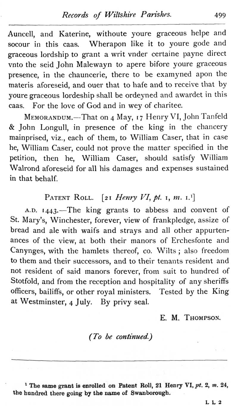 Chapter 12 Montacute, Earl of Salisbury; Records of Wiltshire Parishes; Quakerism in Wiltshire; Feet of Fines for Wiltshire; Sevenhampton; Eyre of Wilts; Eyre of Bromham; Monumental Inscriptions in Corsham Church; Blake; Miscellanea; The Polecat in Wiltshire; Queri